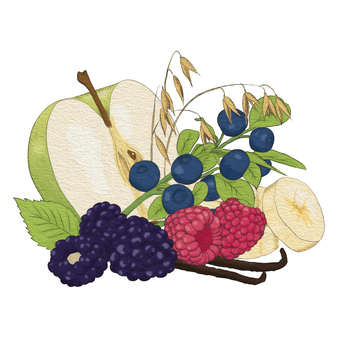Smoothie fylld med frukt, bär, havre och en skvätt kallpressad rapsolja. Naturlig källa till fiber och omega 3-fettsyror.